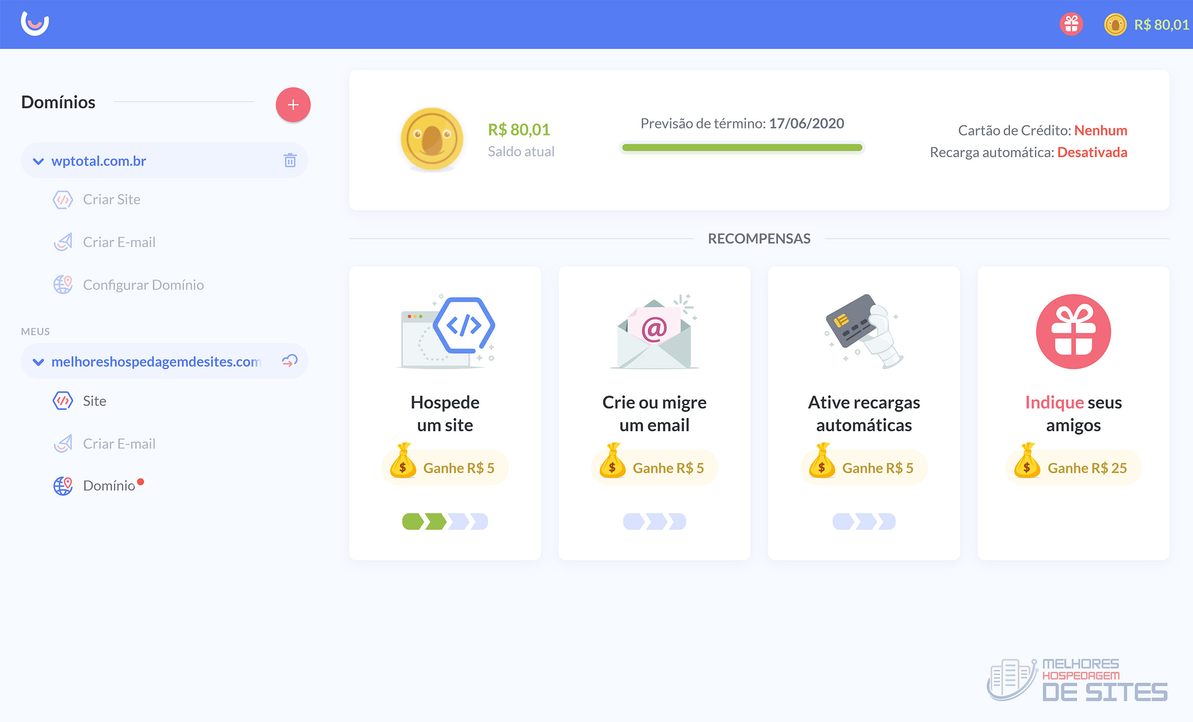 Como a Umbler trabalhar com créditos, também existe um sistema de recompensa. Ao criar ou migrar seu primeiro e-mail, o cliente recebe R$ 5,00 em créditos, o mesmo para quem cadastra a opção de recargas automáticas. Se você indicar um amigo por Facebook, Twitter, Google, LinkedIn ou e-mail e ele se cadastrar e adicionar R$ 25,00 de crédito, você também ganha os mesmos R$ 25,00. Na minha experiência com a Umbler, tive um pequeno blog em que praticamente não precisei adicionar créditos por mais de um mês graças ao programa de recompensas da empresa.